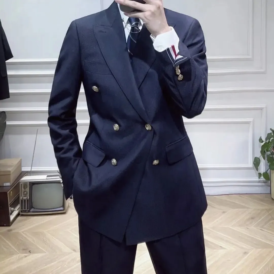 服装:复古海军呢大衣,短款直筒微收腰版型,利落干练剪裁,经典大翻领,双排金属扣,袖袢设计,衣长及大腿上部;重磅高密度海军呢/麦尔登呢面料,厚实紧密,抗风挺括,表面平整光滑,藏青色主调,海军风复古质感。