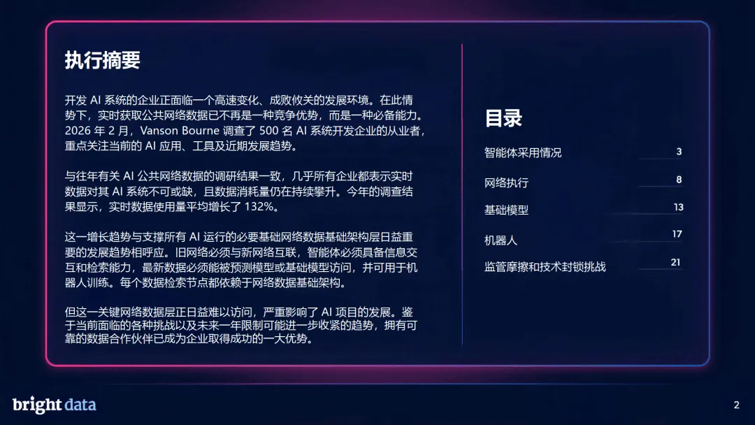 2026 年,实时公共网络数据已成为 AI 系统开发的核心刚需,网络数据基础架构成为 AI 发展的关键支撑,行业正从 “人类网络” 向 “智能体网络” 加速演进,同时面临数据获取、合规监管、技术封锁等多重挑战,与专业第三方数据服务商合作成为企业主流选择。