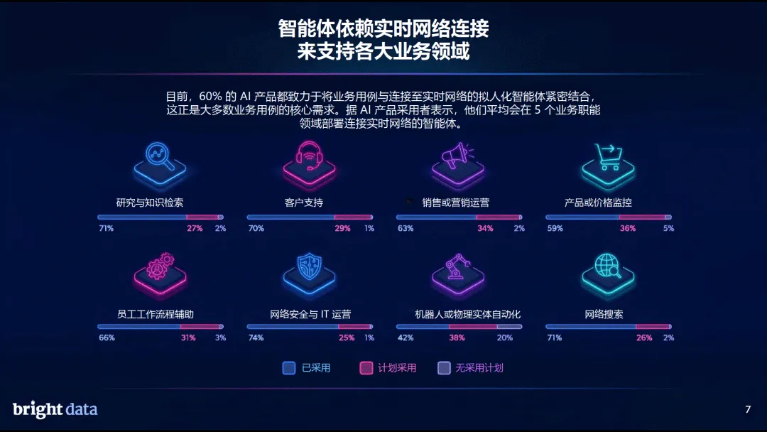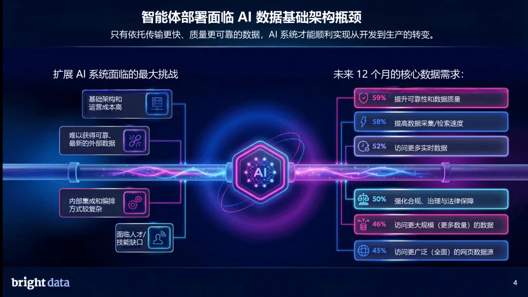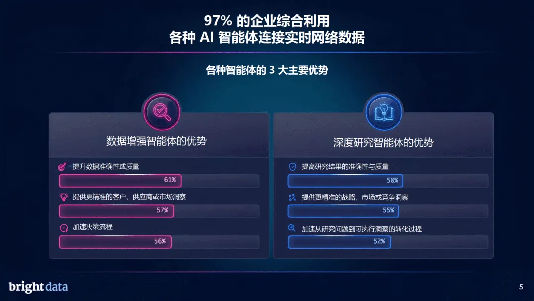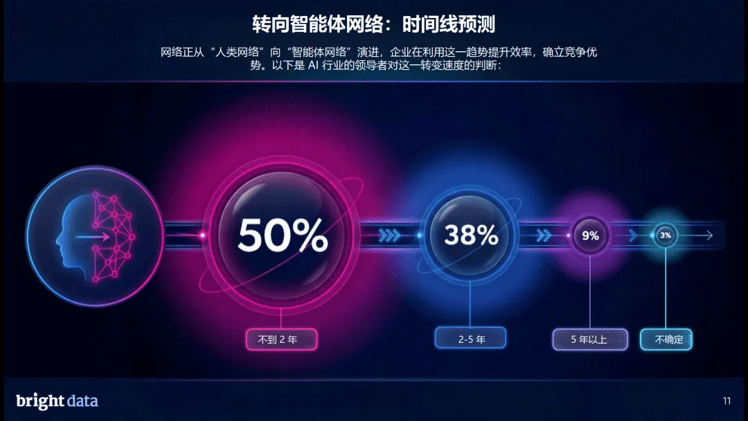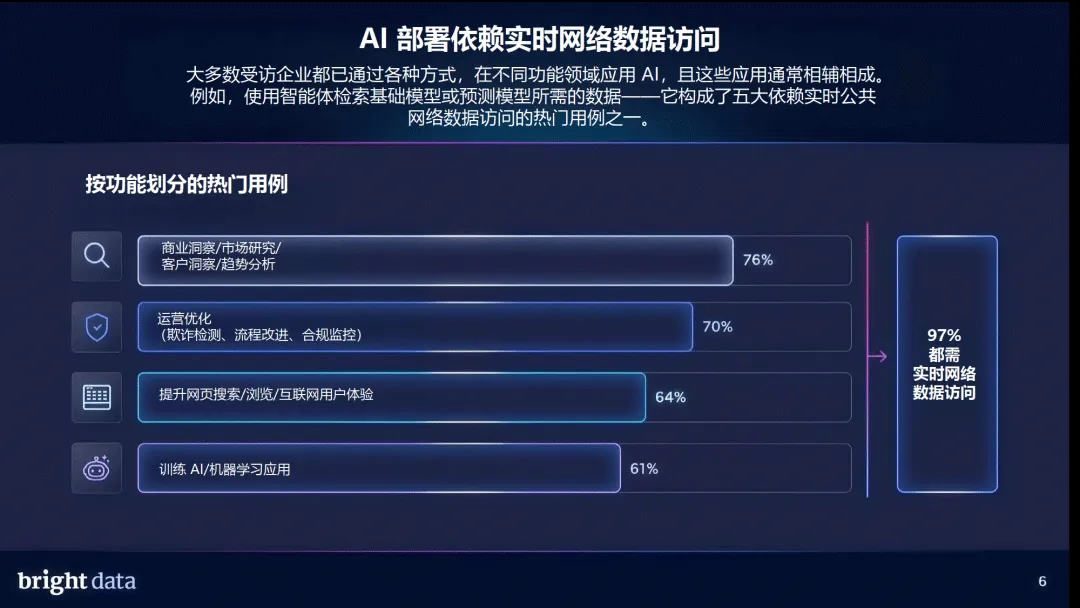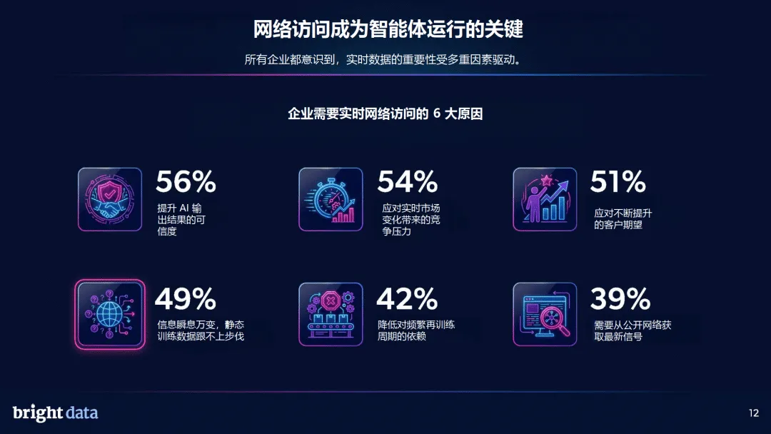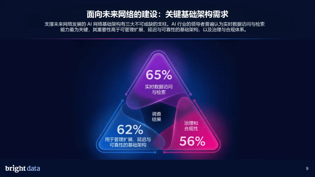 网络架构层面,“两层网络” 趋势明确,87% 的企业认可智能体网络与人类网络并行的格局,71% 的企业已用 AI 智能体开展网络搜索,超半数企业认为不到 2 年将完成向智能体网络的关键转型。实时数据访问与检索、可扩展的基础架构、治理合规是 AI 网络基础架构三大支柱,其中实时数据能力被视为最核心要素。企业需要实时网络数据,核心是提升 AI 可信度、应对市场竞争、满足客户需求,同时降低模型重训依赖。