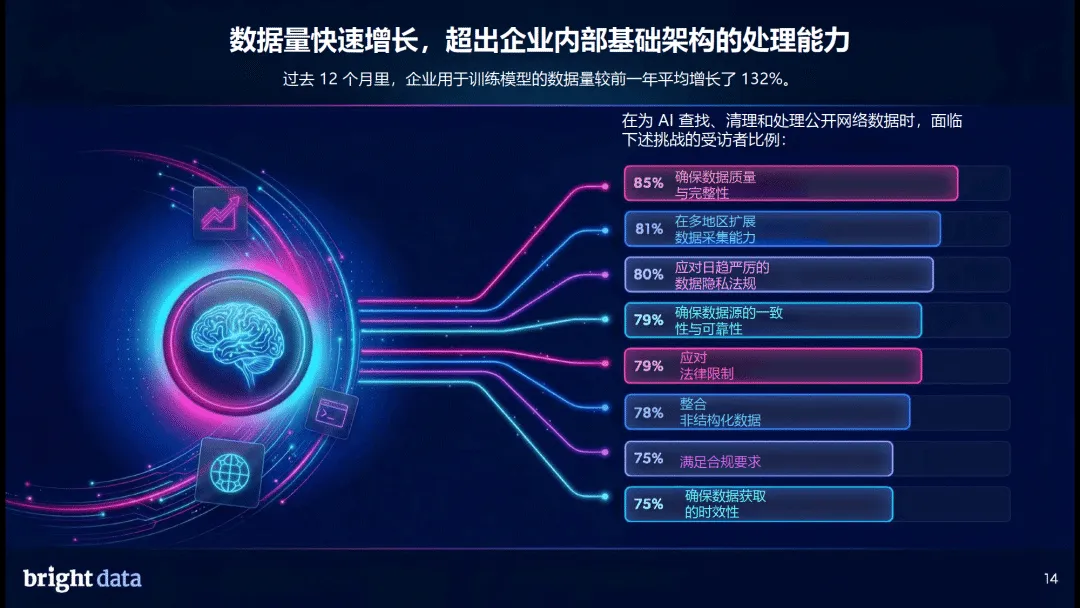 监管与合规层面,行业面临 “合规悖论”,90% 的企业认为监管与技术限制阻碍创新,88% 的企业表示公开网络数据获取难度持续上升,73% 的企业预计监管将进一步加强,58% 认为网站封锁会增加。数据采集的伦理风险突出,敏感数据获取、合规性不足、版权侵权等问题备受关注,企业需通过数据源透明、法律审查、尊重网站规则等方式保障合规。