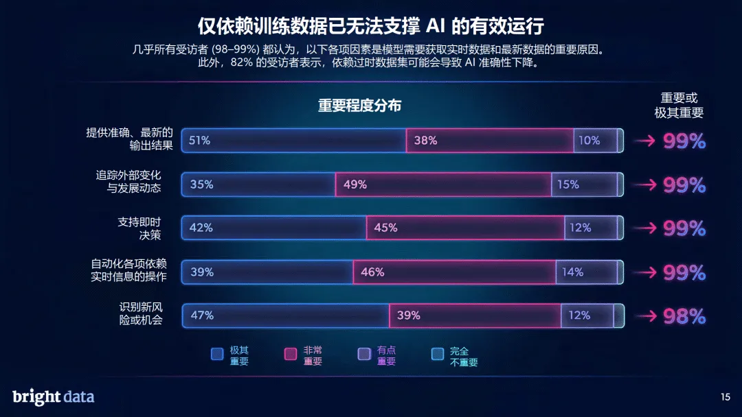 基于行业挑战,65% 的企业计划未来 12 个月依赖第三方网络数据基础架构服务商,仅 35% 坚持完全自研。企业选择第三方合作的核心原因是采集速度快、可靠性高、能有效管控合规与伦理风险。报告指出,AI 系统架构正发生根本性变革,实时、可靠、合规的网络数据能力,将成为企业在 AI 领域竞争制胜的关键。