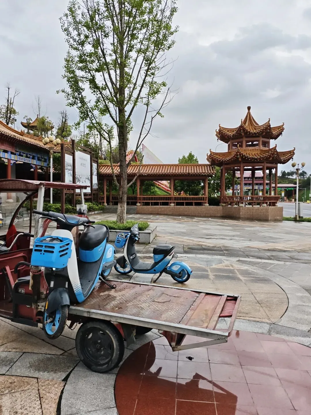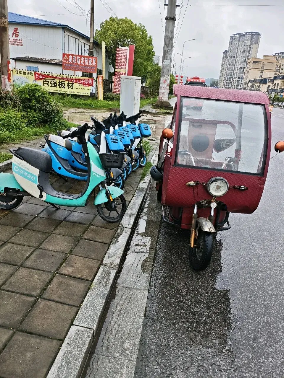 我的战场,是地图上那些APP划出的虚拟边界,和现实里弯弯绕绕的巷子。 就像第一张图里那样,我的红色三轮工具车,和那些整齐的蓝色单车停在一块。我是秩序的维护者,也是混乱的整理者。