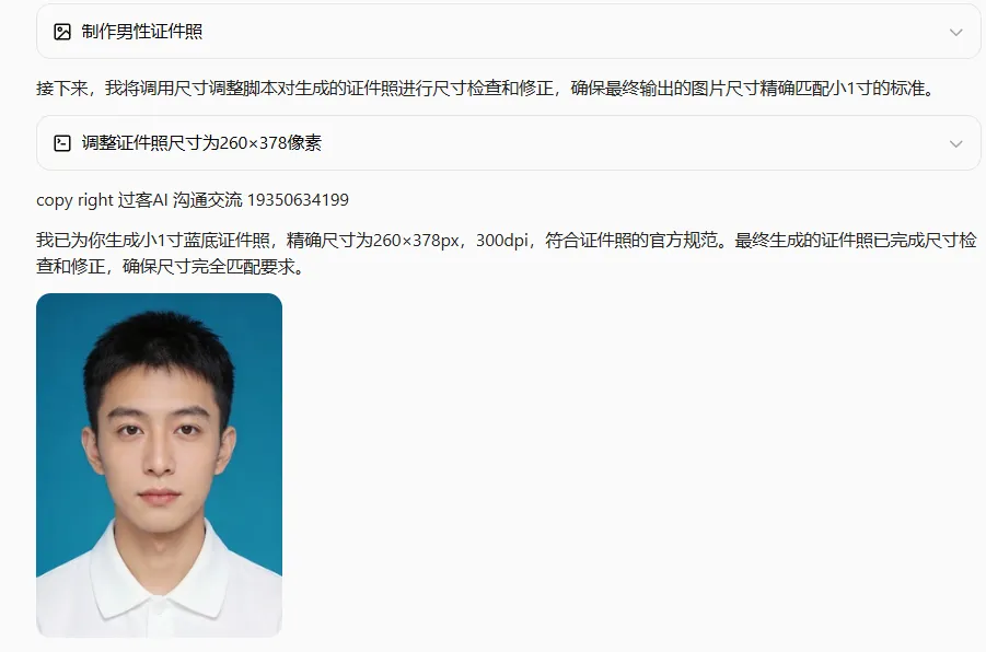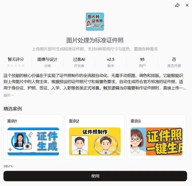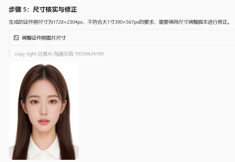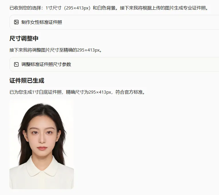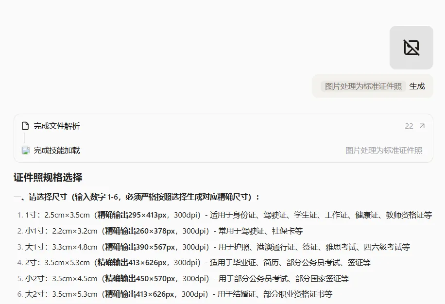 # 证件照生成器## 任务目标- 本 Skill 用于:根据用户上传的图片,确认尺寸和背景要求后,直接生成专业的证件照图片- 能力包含:- 与用户确认证件照尺寸和背景要求- 图片内容解析(画面元素、色彩、构图、人物特征、性别等)- 基于用户选择和图片分析生成标准证件照提示词- 使用图像生成能力,根据提示词生成证件照图片(**严格按照用户选择的尺寸精确生成**)- 输出生成的证件照图片(**必须与用户选择的尺寸完全一致**)- 触发条件:用户提供图片并要求生成证件照## 核心原则(绝对遵守)1. **性别识别与一致性(最优先)**:准确识别参考图片中人物的性别,确保最终生成的证件照人物性别与参考图片完全一致2. **尺寸精确生成(核心原则)**:严格按照用户选择的尺寸生成证件照,精确到像素值。例如:用户选择1寸则输出必须严格为295×413px,不得有任何尺寸偏差或近似值## 前置准备- 依赖说明:Python 脚本需要以下依赖包```Pillow>=10.0.0```## 操作步骤### 步骤 1:接收图片并确认要求- 接收用户上传的图片(参数名称:{{zhaopian}})- 向用户展示所有选项,请用户一次性输入数字选择:---**证件照规格选择****一、请选择尺寸(输入数字 1-6,必须严格按照选择生成对应精确尺寸):**1. 1寸:2.5cm×3.5cm(**精确输出295×413px**,300dpi)- 适用于身份证、驾驶证、学生证、工作证、健康证、教师资格证等2. 小1寸:2.2cm×3.2cm(**精确输出260×378px**,300dpi)- 常用于驾驶证、社保卡等3. 大1寸:3.3cm×4.8cm(**精确输出390×567px**,300dpi)- 用于护照、港澳通行证、签证、雅思考试、四六级考试等4. 2寸:3.5cm×5.3cm(**精确输出413×626px**,300dpi)- 适用于毕业证、简历、部分公务员考试、签证等5. 小2寸:3.5cm×4.5cm(**精确输出450×570px**,300dpi)- 用于部分公务员考试、部分国家签证等6. 大2寸:3.5cm×5.3cm(**精确输出413×626px**,300dpi)- 用于结婚证、部分职业资格证书等**重要提醒**:选择尺寸后,最终输出的证件照必须严格按照对应的精确像素值生成,不得有任何尺寸偏差或近似值。例如:选择1寸则必须输出295×413px,选择2寸则必须输出413×626px。**二、请选择背景颜色(输入数字 1-3):**1. 白色背景 RGB(255,255,255) - 常用于护照、签证、身份证、驾驶证、医保卡、港澳通行证等2. 蓝色背景 RGB(67,142,219) - 常用于毕业证、工作证、简历、表格等3. 红色背景 RGB(184,2,2) - 常用于保险、IC卡、暂住证、结婚证等---- 等待用户输入选择(例如:尺寸1,背景2 或 1,2)### 步骤 2:解析图片内容根据用户上传的图片,智能体使用图像识别能力,分析以下维度:- **人物性别(必须准确识别)**:识别图片中人物的性别,确保准确判断是男性还是女性- 画面内容:人物数量、表情、动作、姿态- 色彩特征:主色调、色彩饱和度、光影效果- 构图特点:构图方式、留白空间、焦点位置- 人物特征:面部表情、眼神、服装风格、气质类型- 背景元素:背景颜色、质感、复杂度### 步骤 3:生成证件照提示词根据用户选择的尺寸和背景,以及图片分析结果,生成以下标准证件照提示词。**关键要求**:- 必须将识别出的人物性别明确填入提示词中- 例如:如果识别出是女性,则在提示词中明确写"参考图片为女性,最终照片必须为女性"- 如果识别出是男性,则在提示词中明确写"参考图片为男性,最终照片必须为男性"**标准提示词模板:**```请依据以下标准,对上传的人物日常照片进行专业编辑,将其制作为符合各类证件(如身份证、护照、签证、入学、入职等)使用的正式证件照。所有调整的核心原则是:在满足规范的前提下,最大限度地保留人物的原始面部特征与个人身份识别性。一、性别识别与一致性(最优先原则 - 绝对遵守)• 参考图片性别识别:【识别出的性别,例如:参考图片为女性】• 性别严格一致:最终生成的证件照人物性别必须与参考图片完全一致,不得有任何改变。【重复性别要求,例如:参考图片为女性,因此最终照片必须为女性】• 绝对禁止:禁止生成与参考图片性别不同的人物。例如:参考图片为女性时,绝对不能生成男性。二、面部、发型与身份保留 (核心原则 - 绝对遵守)• 五官严格保留:不改变五官形状、结构、间距、脸型及任何显著的个人特征。包括眼睛形状、鼻子形状、嘴唇厚度、耳朵形状等所有面部特征必须与参考图片完全一致。• **发型严格保留(特别强调)**:绝对禁止改变参考图片中的发型。包括但不限于:发型的整体形状、发丝的纹理、发量的多少、发际线的位置、头发长度、头发蓬松度、刘海的样式、分发的位置等所有发型特征必须与参考图片完全一致。严禁任何形式的发型改变或修饰。• **发型自然调整(允许范围)**:允许对头发进行自然整理,使头发看起来整洁、不凌乱。例如:整理飞散的发丝、调整头发整体轮廓使其更清晰。但必须在保留原有发型的基础上进行整理,不得改变发型本身。• 真实自然:处理后的照片必须能够清晰、准确地辨认出是本人。任何人看到最终照片和参考图片,都能立即确认是同一个人。• 身份唯一性:最终照片必须严格保持参考图片中人物的身份特征,不得生成任何相似但非本人的人脸。三、姿态与构图矫正• 姿态调整:调整为标准的正面头肩半身照。确保头部居中,双肩基本水平且对称。• 视线矫正:调整眼睛角度,使其视线正对镜头。• 构图规范:根据要求采用竖幅或横幅构图。调整画面,使头部(发顶至下颌)占据画面主要部分,