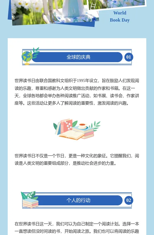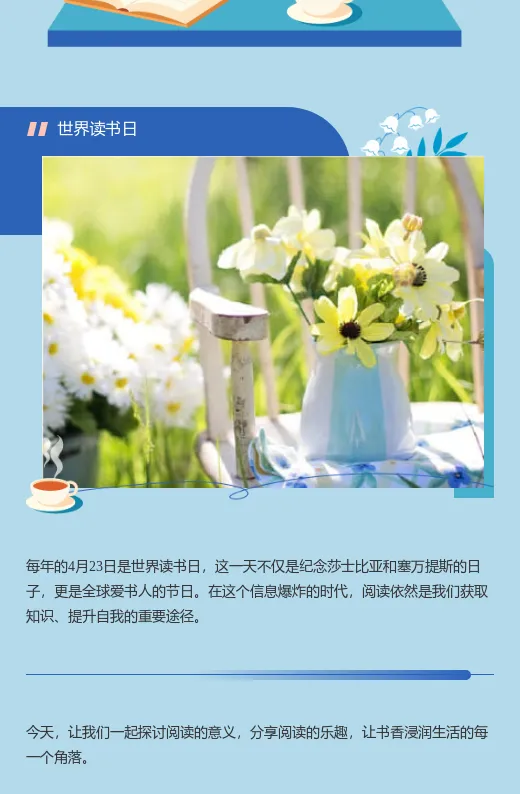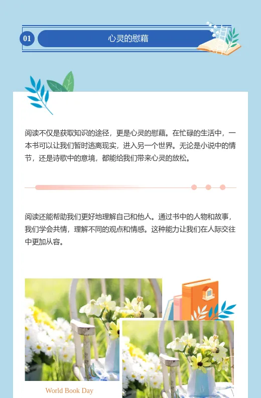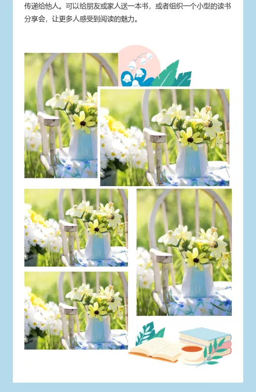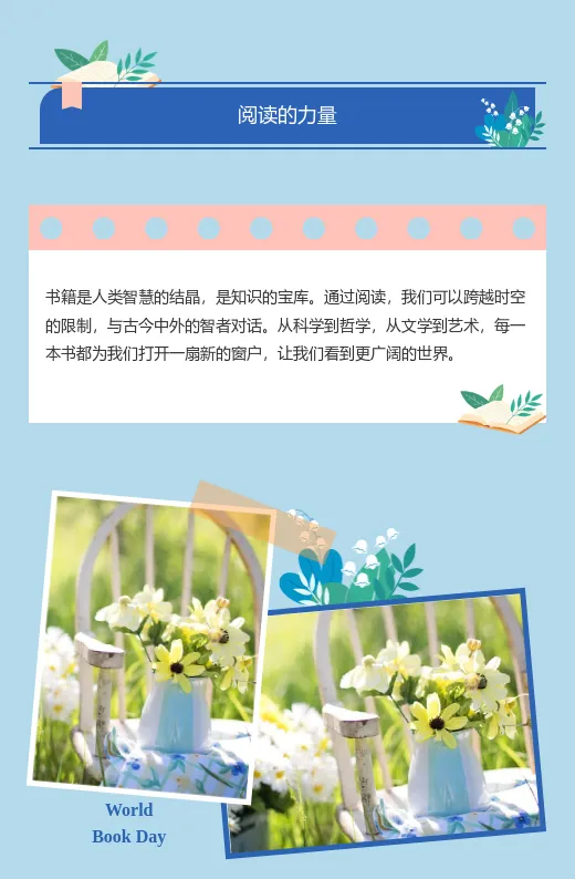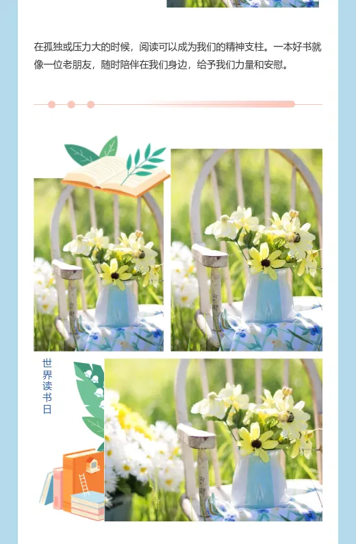 写读书日推文时,总觉得内容干巴巴的,吸引不了读者?其实,你可以结合“书籍花草”主题,推荐一些与自然相关的书籍,或者分享读书与养花的心得。用小墨鹰编辑器的模板,轻松打造文艺清新的排版效果,让推文看起来更有质感。内容+排版双管齐下,还怕没人看吗?