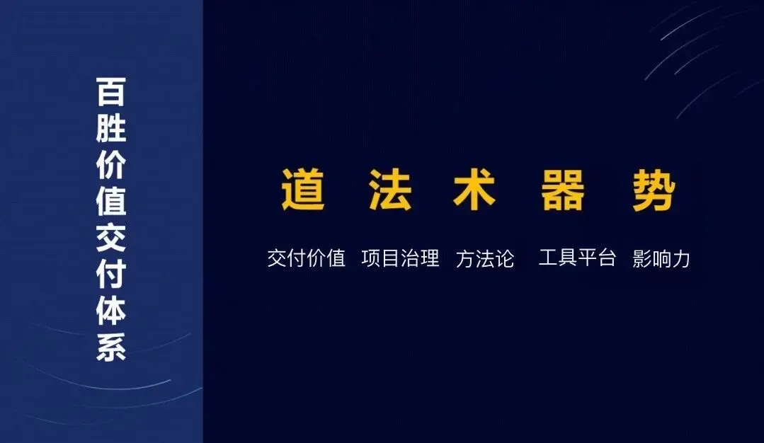 借鉴中国传统的管理哲学,我们将价值交付体系构建为“道、法、术、器、势”五个层面。简单说来,“道”指创造价值,帮助客户成功,成就智慧品牌。“法”是指通过政策、制度、流程、规范、组织、资源、知识、数据等,提升目标与过程的一致性,增强组织协同能力。“术”是研究和落实交付方法论,适应敏捷、瀑布、混合型项目交付的需要,提高项目成功率。“器”是指构建交付-产品-研发一体化项目管理平台,提高信息流动效率,提高信息流的一致性,提高决策和行动的有效性。“势”是指保持交付团队、交付伙伴与时俱进,不断成长,始终具备服务零售客户,赋能零售行业,成就智慧品牌的强大影响力!这套价值交付体系,我们将持续探索,不断演进,以适应公司发展和客户信息化建设以及数智化转型的需要。