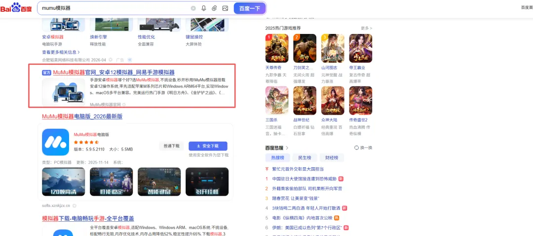 在百度搜索栏输入 “MuMu 模拟器”(雷电等模拟器也可以),然后在搜索结果中找准 MuMu 模拟器官网进入。