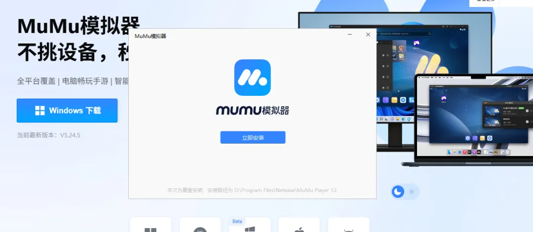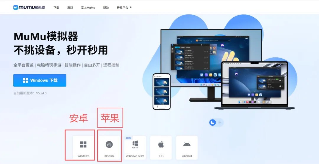 在MuMu模拟器官网页面,后面根据自己的电脑系统选择对应的按钮下载