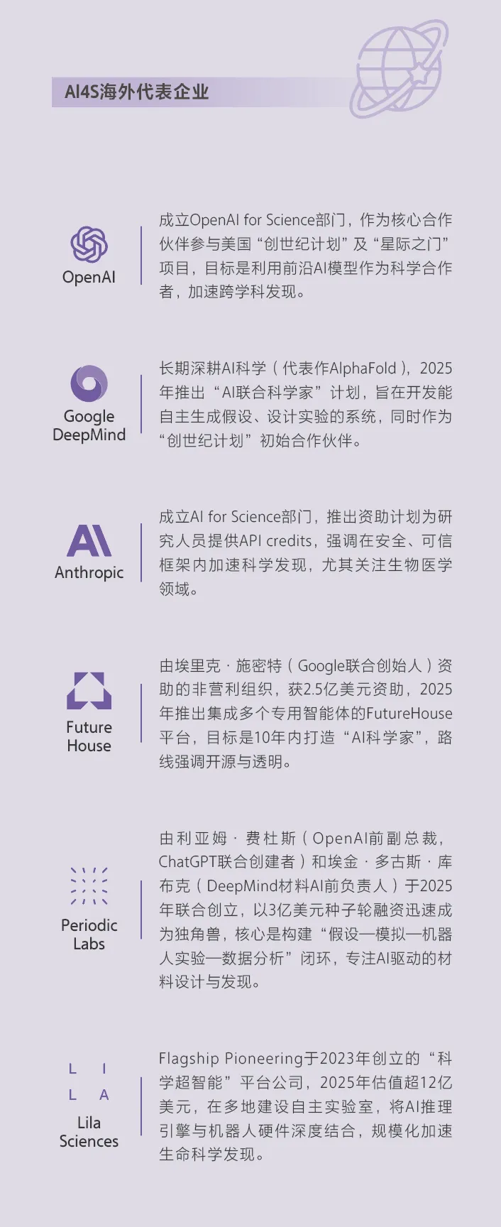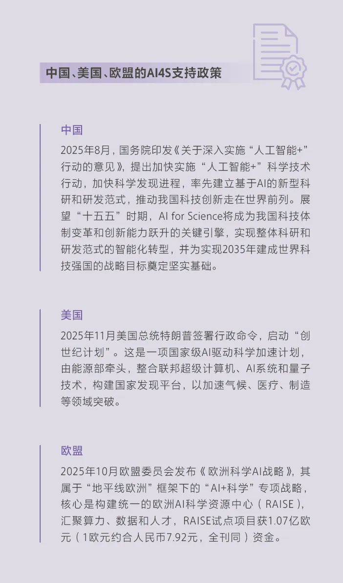 各国政府也在加注,中美欧都出台了国策级别的AI4S支持计划。中国发布《关于深入实施“人工智能+”行动的意见》,提出加快实施“人工智能+”科学技术行动,加快科学发现进程,率先建立基于AI的新型科研和研发范式;欧盟委员会2025年在“地平线欧洲”(Horizon Europe)计划中提出支持科研领域在AI和算力方面的投入;美国直接推出了“创世纪计划”(Genesis Mission),试图构建一套全国性的AI科学基础设施,这是美国继曼哈顿计划和阿波罗登月计划之后,又一国家最高级别的科学计划。
