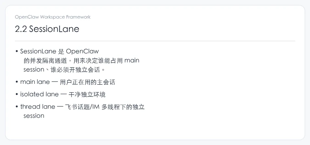 说到底,这不是“模型突然不行了”,而是 session 设计还没准备好进入组织。个人场景里,一个主会话很多时候够用;组织场景里,lane、thread、isolated session 这类并发隔离迟早都得补上。cron 会不会占住主线,子任务会不会回灌污染,多人请求能不能分流,本质上都是这一个问题。
