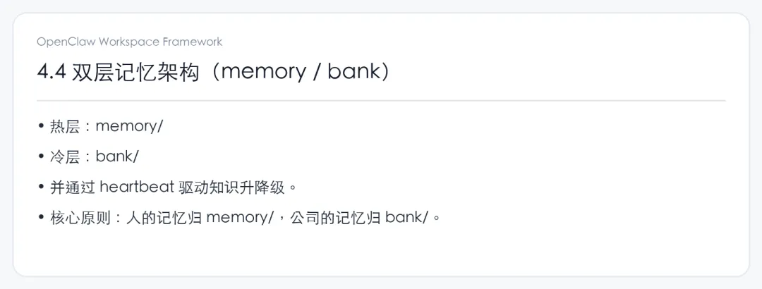 所以最后一定会走到 memory 结构的问题:什么该放进 daily,什么该挂进 tasks,什么要沉到长期知识库,什么只该留在短期上下文里,什么必须版本化,什么必须能被检索和追溯。