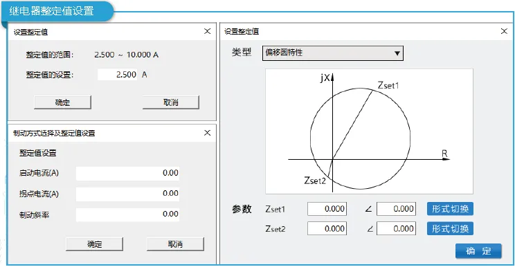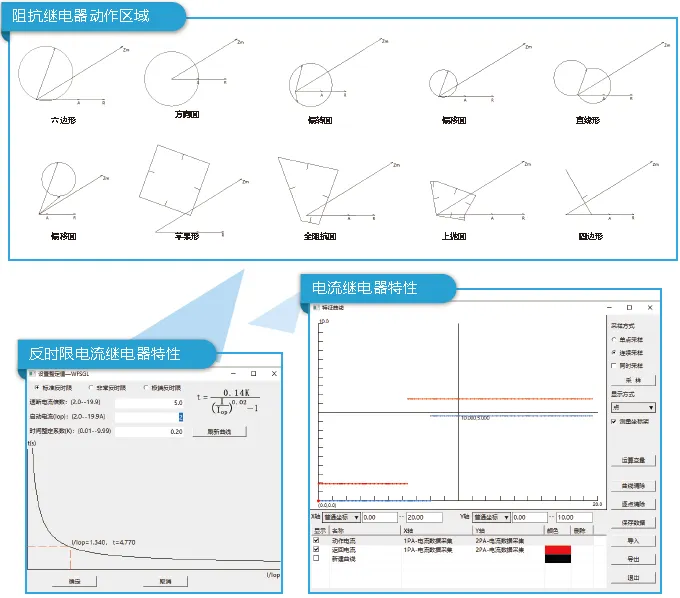 提供电流继电器特性、电压继电器特性、功率方向继电器特性、信号继电器特性、时间继电器特性、反时限继电器特性和阻抗继电器动作区域等继电器特性。