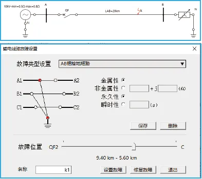 用户可根据需要对元器件、线路进行故障模拟,故障类型包括单相接地短路故障、两相接地短路故障、两相相间短路故障、三相接地短路故障、三相相间短路故障及断相故障。