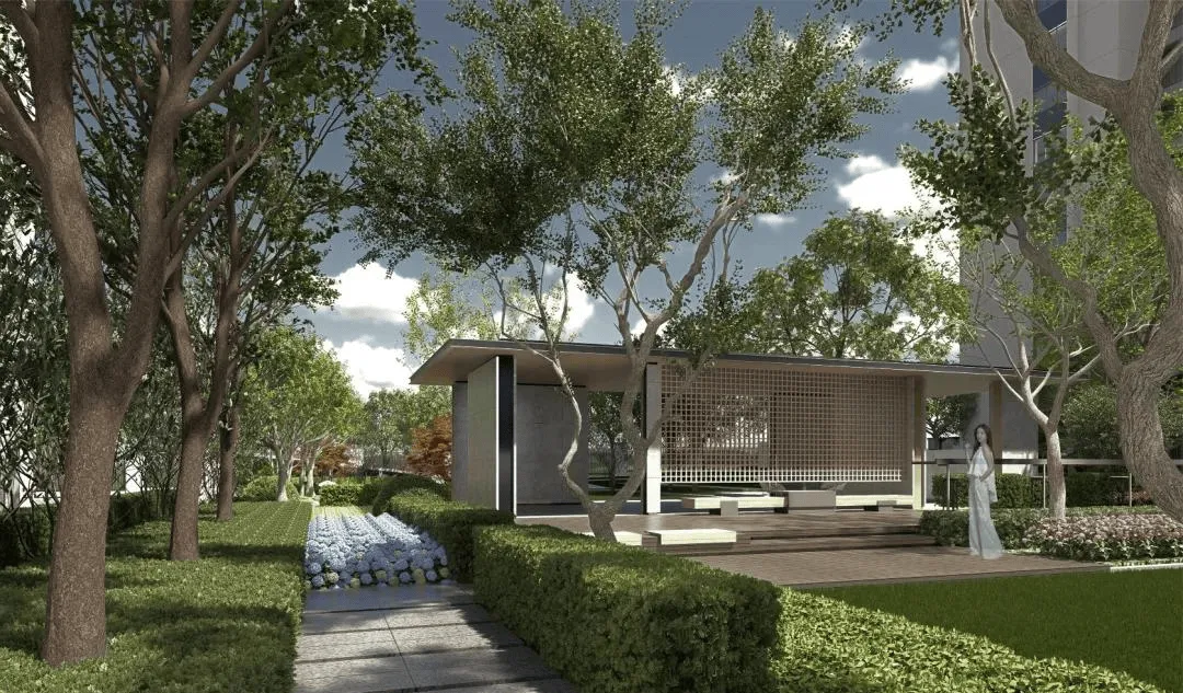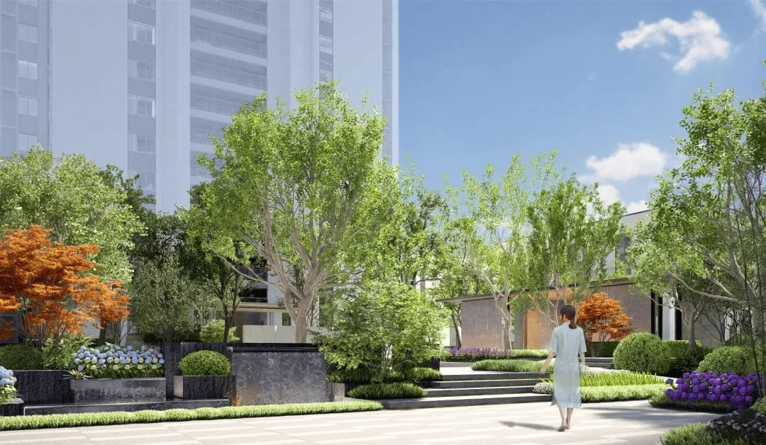 【都市森居,写意山水】轩阅里以“轩阅雲台”为主题,提炼中国山水画作自然形态及视觉构图,创新应用现代景观手法,打造层次丰富的自然森境花园。