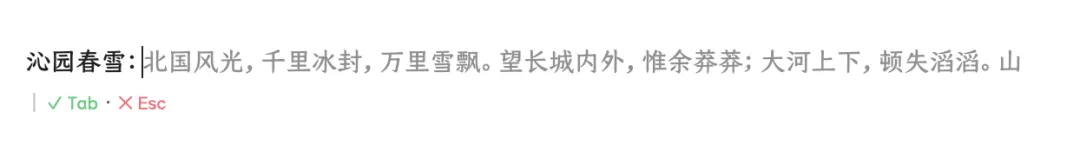 拒绝机制很佛系:没有专门的 Esc 键,只要你动一下光标,或者打了和 AI 预测不同的字,补全就自动消失。