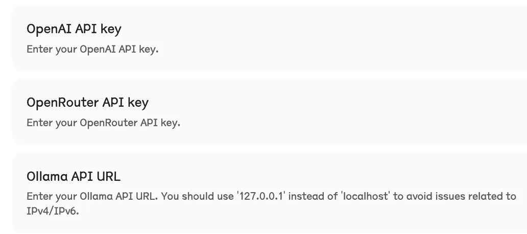 模型供应商只支持三家,OpenAI、OpenRouter 和 Ollama,国内用户直接上手会有点费劲。
