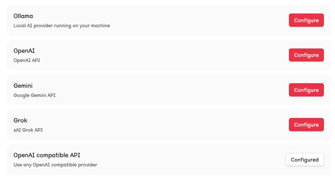 供应商支持比较齐全,OpenAI、Ollama、Gemini、Grok 都有,最关键的是有一个 OpenAI compatible 选项,也就是说你可以接 DeepSeek、硅基流动、火山引擎,对国内用户友好多了。
