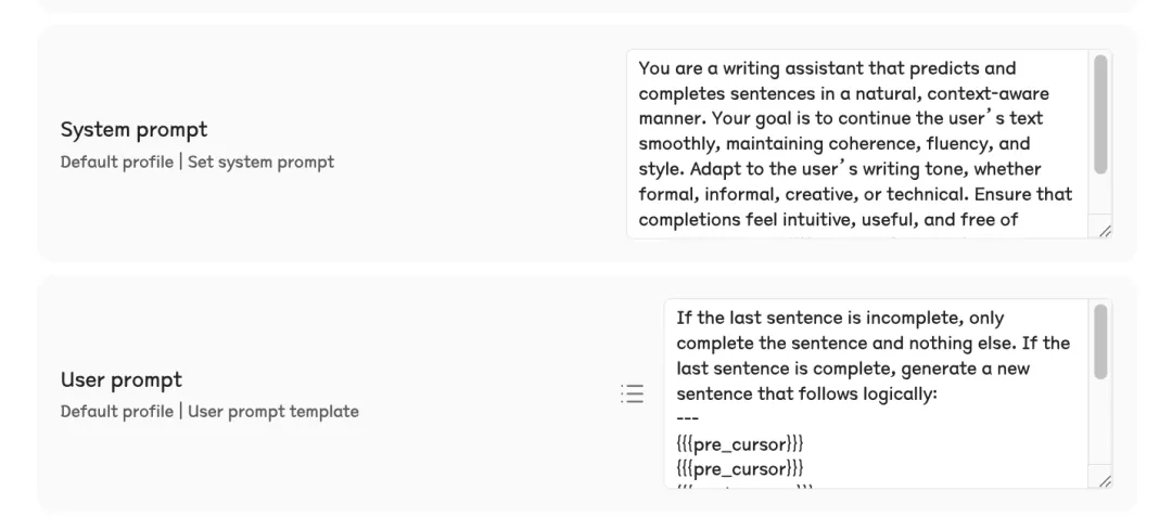 更聪明的地方在于,它会先判断你光标落在哪种 Markdown 元素里,是标题、段落、列表项、引用块,还是代码块,然后换不同的提示词去问模型。写代码时它甚至能识别出是 Python 还是 JavaScript,把语言信息一起塞进去。每种上下文有独立的 few-shot examples,让补全风格更对味。
