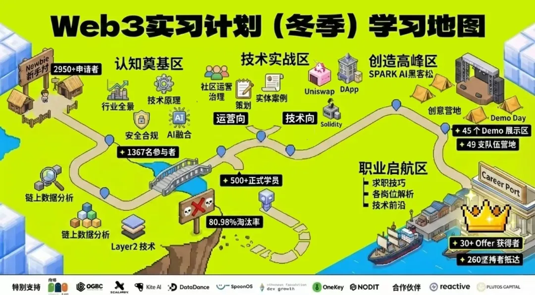 25 冬季 Web3 实习计划吸引 2900 + 申请,筛选出 500 +优质学员入营,最终产出 49 个可展示 Demo,成功对接 35 + 行业岗位