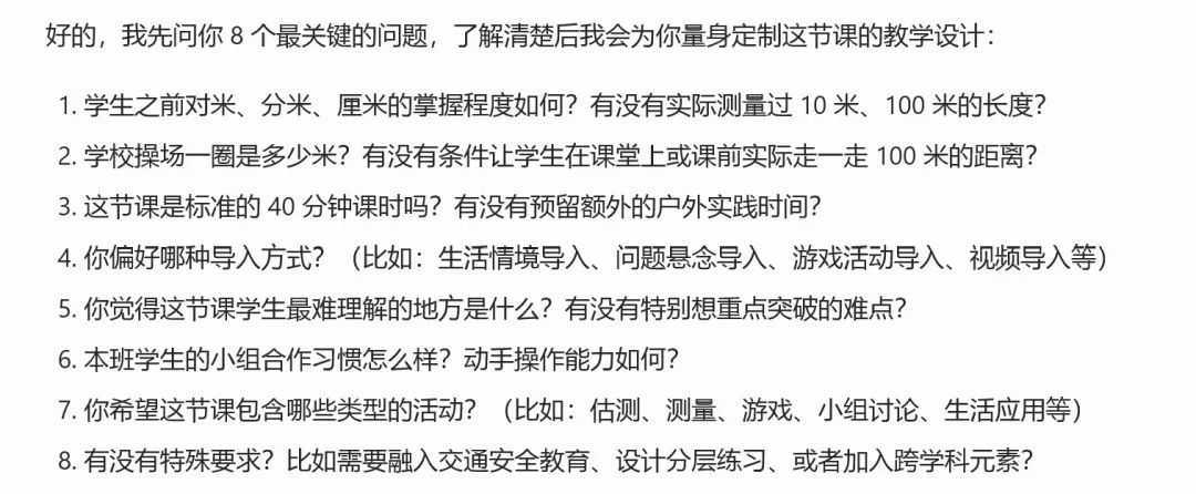 “我要设计一节北师大版三年级《认识一千米有多长》的课,你先别写教案,先向我提十个以内你最想了解的问题,比如学生基础怎么样、我偏好什么导入方式、有没有特别想突破的难点等等。等你问清楚了,再根据我的回答生成一份适合的教学设计。”