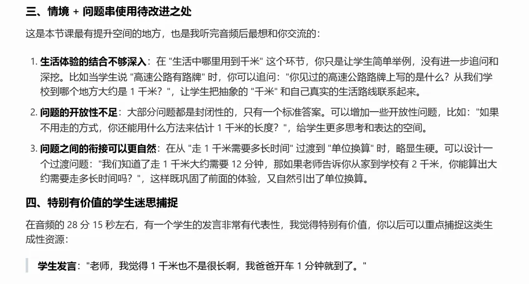 AI给出的反馈当然不能全信,但它经常能点到一些我们自己意识不到的惯性动作。比如你可能习惯性地在提问后不到三秒就自己把答案说了,或者经常使用某个低年级孩子无法理解的概念。这些细节,AI 会一条一条帮你拎出来。