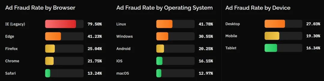 3️⃣桌面端投放:无效流量率27.03%,比移动端高40%。桌面端的脆弱性主要是源于机器人部署更容易和老旧操作系统,而后者是最容易被忽略的一点。