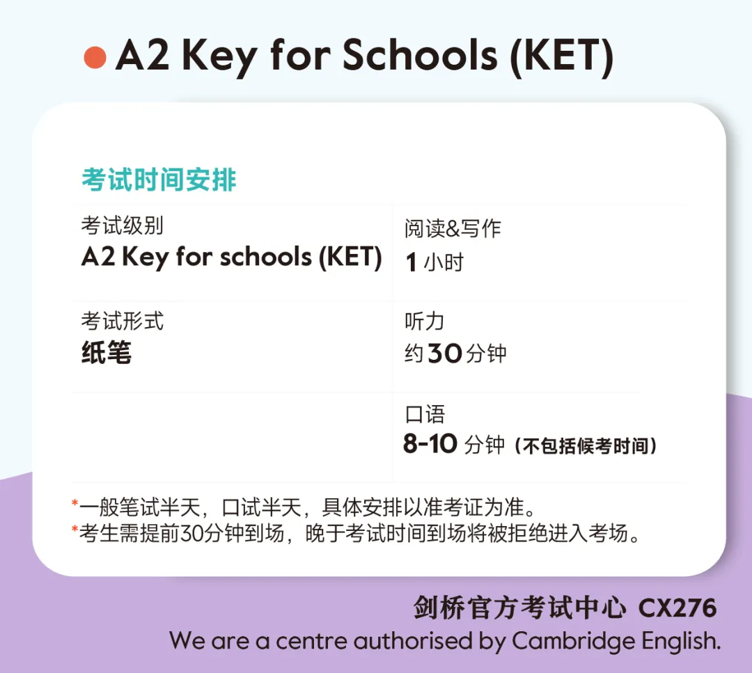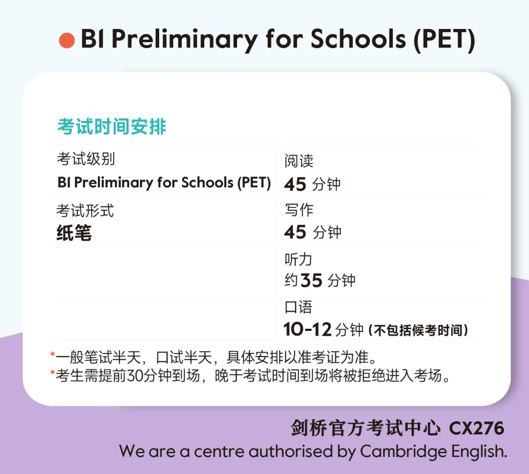 请自备B 或 HB 铅笔、橡皮;参加 PET、FCE 考试的考生另请携带黑色或深蓝色签字笔,KET 考试写作环节无需携带签字笔。