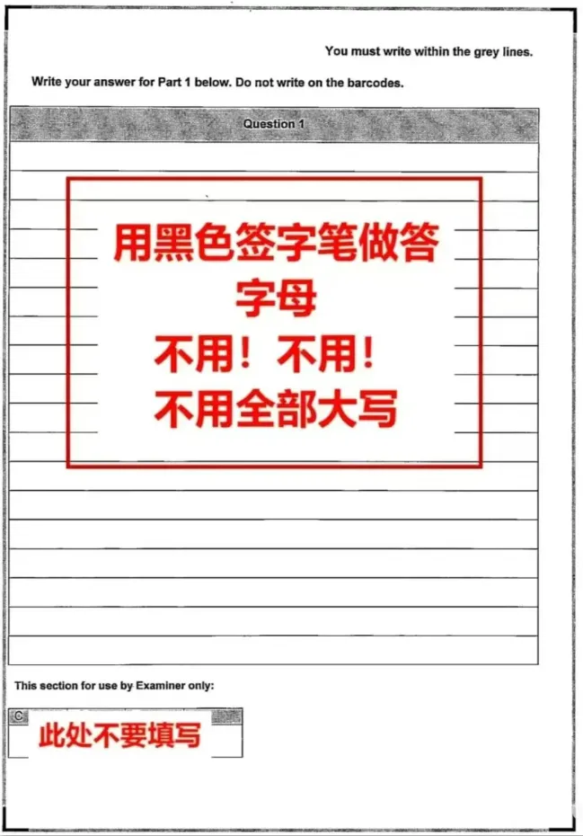 考试期间请妥善保管个人作答内容,严禁抄袭或协助他人抄袭。如剑桥官方评卷过程中发现相邻座位考生答卷存在高度雷同,相关考生成绩均将作无效处理。