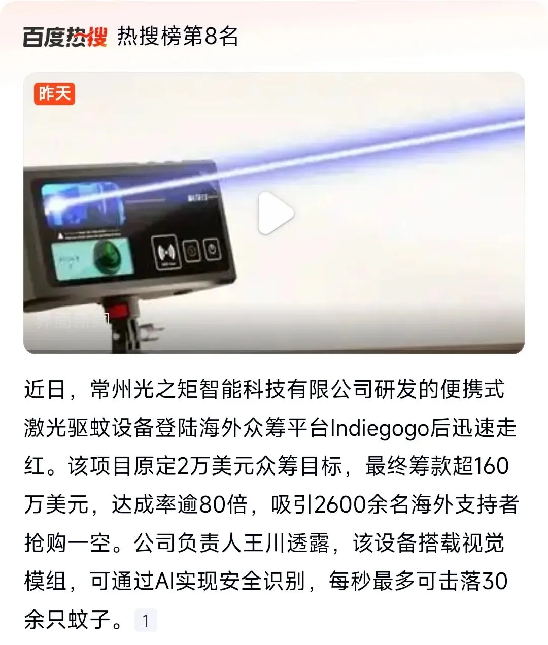 近日,一款来自中国常州的硬核科技产品,在海外市场掀起了一场“灭蚊革命”。由常州光之矩智能科技有限公司研发的Photonmatrix便携式激光驱蚊设备,登陆海外众筹平台Indiegogo后迅速走红,以80倍超额众筹、160万美元筹款、2600余名海外支持者的惊人战绩,成为国产黑科技出海的现象级标杆。
