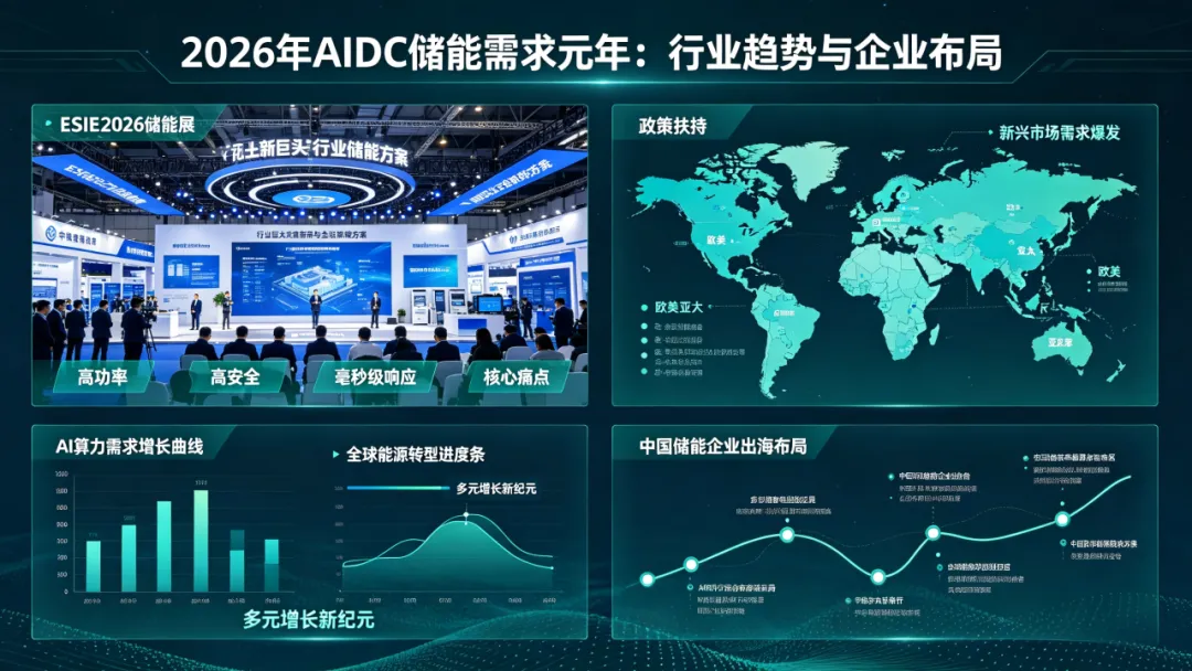 2026年被视为AIDC储能需求元年。在ESIE2026储能展上,行业巨头聚焦AIDC高功率、高安全、毫秒级响应的核心痛点,发布了多款储能新品与解决方案。同时,全球多国密集出台政策扶持储能,新兴市场需求爆发,中国储能企业加速出海。在AI算力与全球能源转型共振下,储能正迎来多元增长的新纪元。