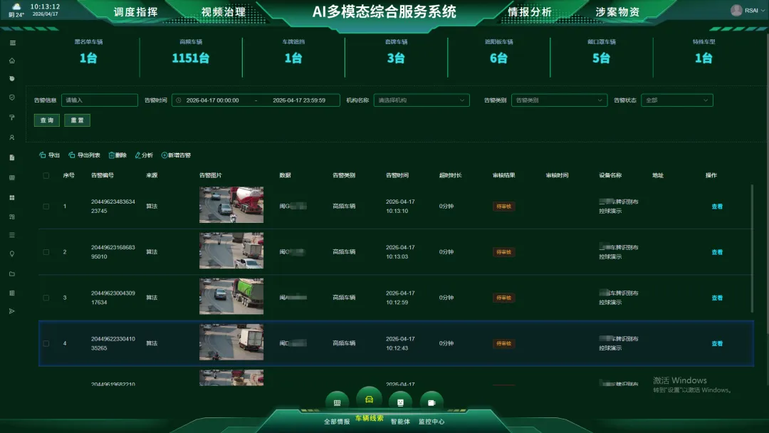 AI 融合通讯调度指挥模块,打通各类设备数据壁垒,实现执法记录仪、无人机、AI 球机等设备统一调度,形成高效闭环的执法管理体系。末端 AI 情报分析模块,依托车牌识别、异常行为研判等算法,对遮挡号牌、异常车辆轨迹等线索自动预警,推动监管从被动处置向主动预判转变。