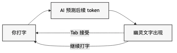它的工作原理接近一个非常强的自动完成:你打几个 token,它预测接下来最可能出现的 token 序列,以幽灵文字(ghost text)呈现在光标后面。按 Tab 接受,继续打字拒绝。
