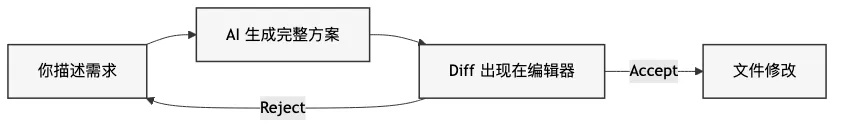 这是 2023-2024 年的主流形态。你在 Chat 面板描述需求,AI 给你一段修改方案,你选择接受或拒绝,diff 直接应用到文件。