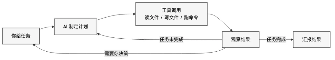 它可以读文件(不只是你打开的那个),可以写文件,可以执行 shell 命令,可以运行测试,可以 grep 整个仓库。它有了一套计划-执行-观察的循环。你给它一个任务,它自己想办法完成,途中只在需要你做决策时打断你。
