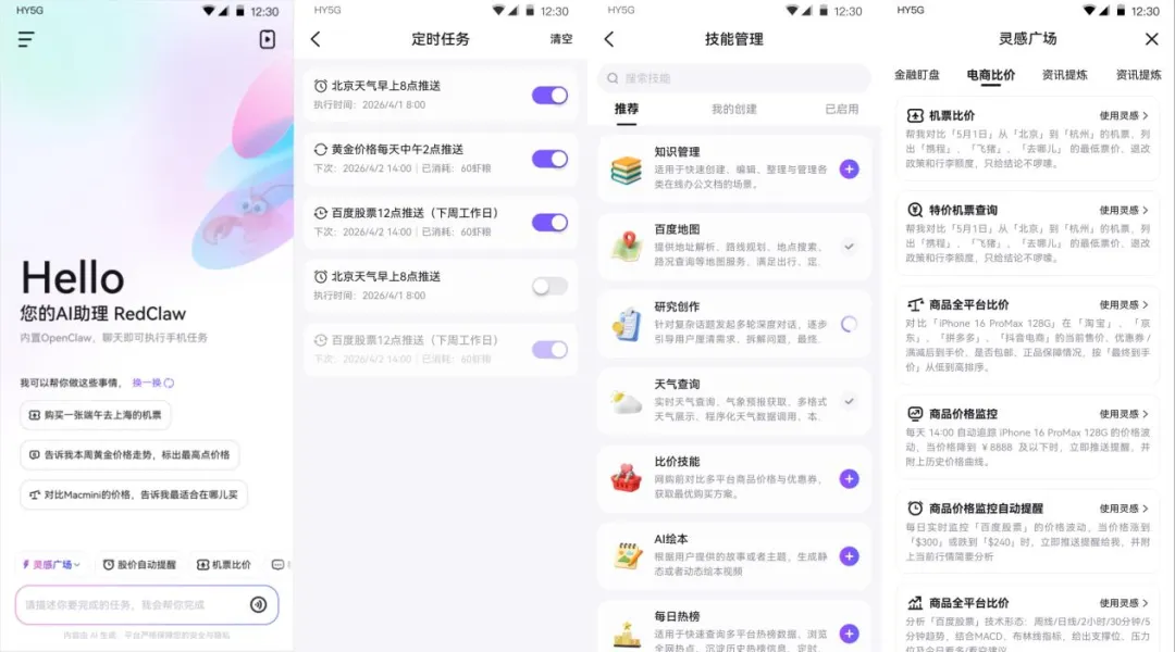 RedClaw作为全球首款原生移动端OpenClaw应用,颠覆传统AI助手形态,打造面向普通用户的零门槛、免部署手机端AI操作型智能体。依托大模型与灵活可扩展Skill技能体系,它实现AI从“被动回答”到“主动执行手机任务”的跨越,通过云端虚拟手机、VLA多模态大模型及OpenClaw框架,在云端安全环境完成跨App复杂操作,兼顾功能强大与物理级隐私隔离。其核心功能覆盖四大维度:自然语言一键指令,语音/文字即可让AI模拟真人触屏操作;跨App自动化执行,自动跳转完成订票、比价、签到等闭环任务;按需安装多领域Skill,适配信息查询、内容创作、生活娱乐等场景。这款助手有效地降低了AI使用门槛,无需掌握专业技术配置,就能让AI自动完成日程管理、内容生成、设备联动等全流程任务,成为高效便捷的个人专属助手。