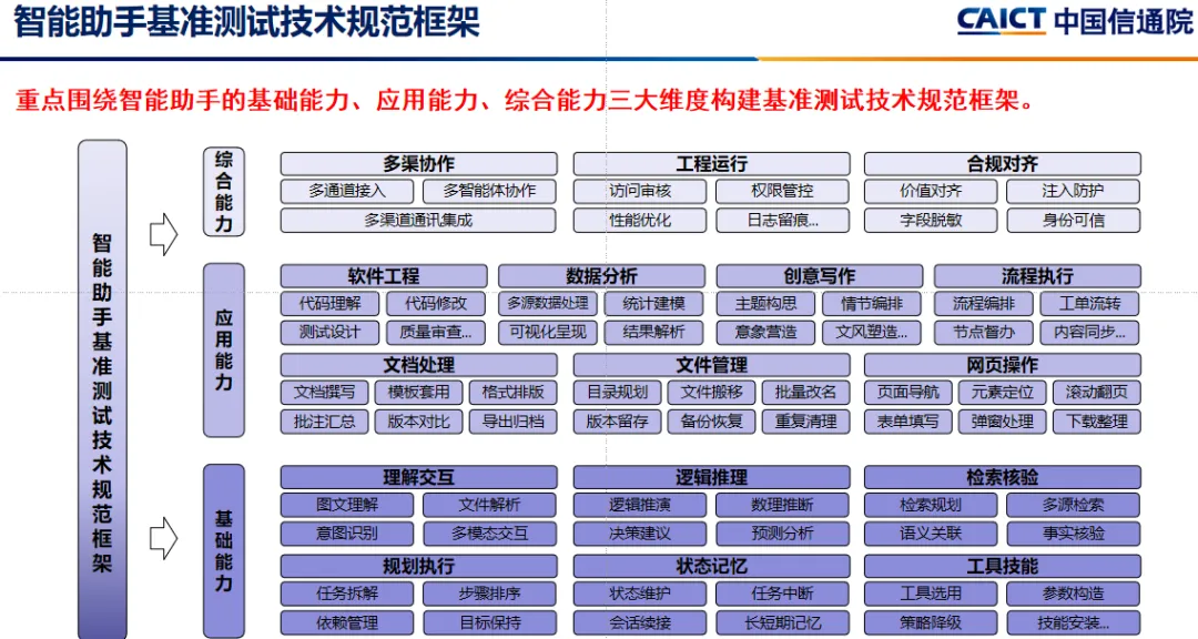 随着人工智能技术加速向现实世界场景渗透,以OpenClaw为代表的智能助手正从概念验证迈向规模化应用。智能助手通过将复杂操作指令转化为对本地或远程系统的直接操控,实现从“信息处理”到“任务执行”的能力跨越,成为重塑人机交互范式与产业数字化发展格局的关键动能。中国信息通信研究院(以下简称“中国信通院”)人工智能研究所高度关注智能助手技术及应用发展动态,联合业界多家单位共同编制并发布了智能助手基准测试通用框架,并依据通用框架开展评估工作。