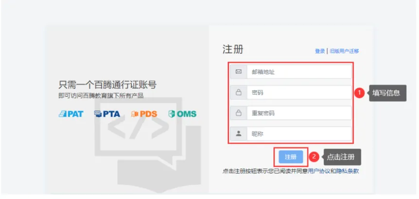 点击PTA首页右上角的“注册”跳转到注册界面:
