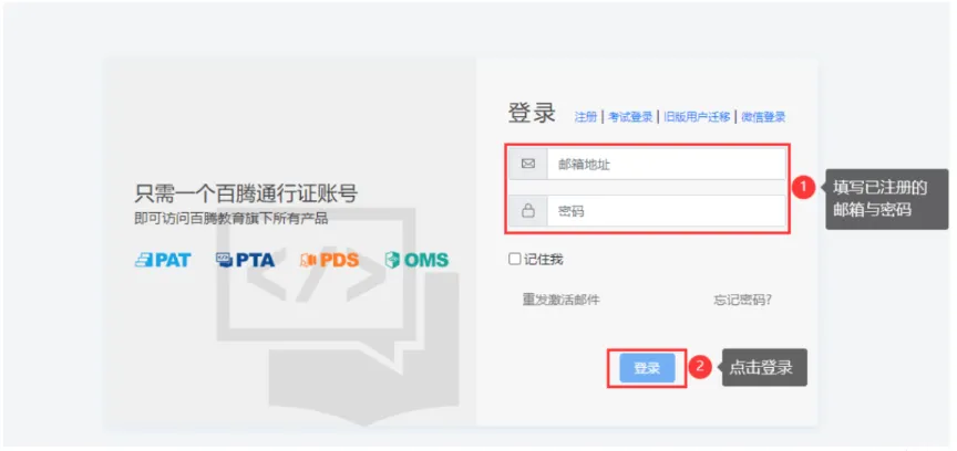 点击PTA首页右上角的“登录”跳转到登录界面: