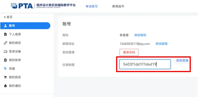 2.输入邀请码(5403f1dd1f7d4d19)点击接受做题;
