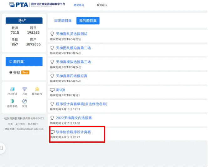 3.返回主页,点击我的题目集,可以找到软件协会程序设计竞赛(4月28日19:00题目集准时开放)。