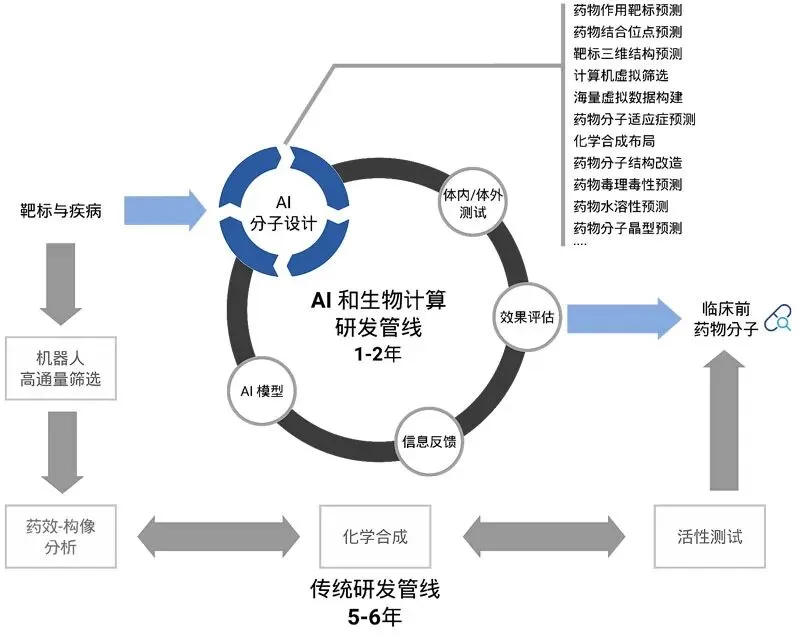 AI介入的价值,正是在于用计算能力压缩这个失败漏斗。当AI能够在分子设计阶段就预测出更高概率有效、更低毒副作用的候选化合物,整个研发周期就会从根本上被重塑。