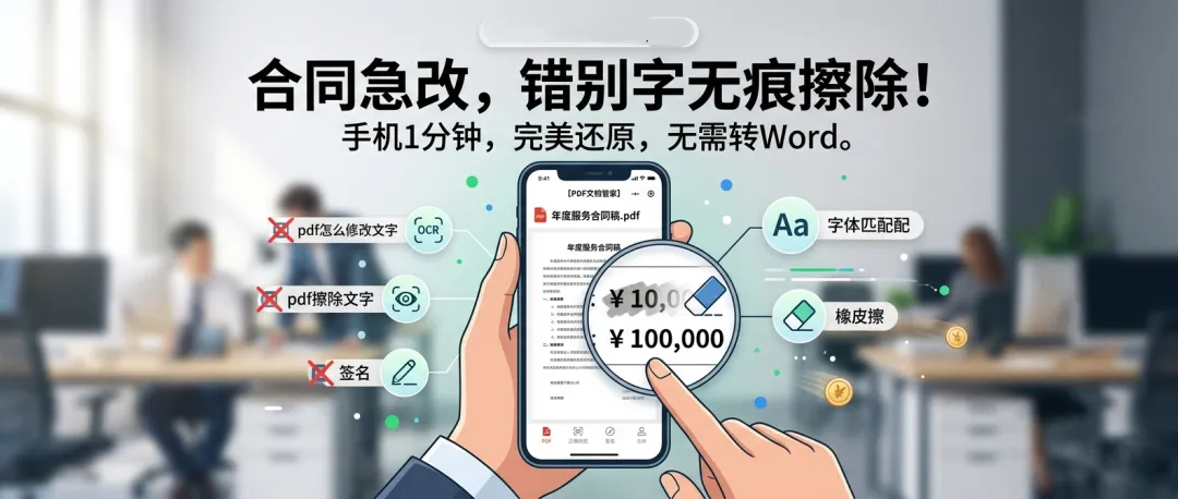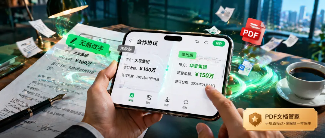 做业务的朋友,肯定都遇到过这种“争分夺秒”的时刻: 客户终于松口了,在微信上催你:“赶紧把合同发过来,我现在就签字付款。” 为了抢时间,你翻出了一份之前做好的、条款极其完美的PDF版旧合同。只要把里面的“前客户公司名”和“旧的底价”改成新的,就能直接发过去。 但尴尬的是,PDF就像一块铁板,点不进去,也删不掉字。眼看着客户那边还在催,你却被卡在了一个名字和几个数字上,急得像热锅上的蚂蚁。
