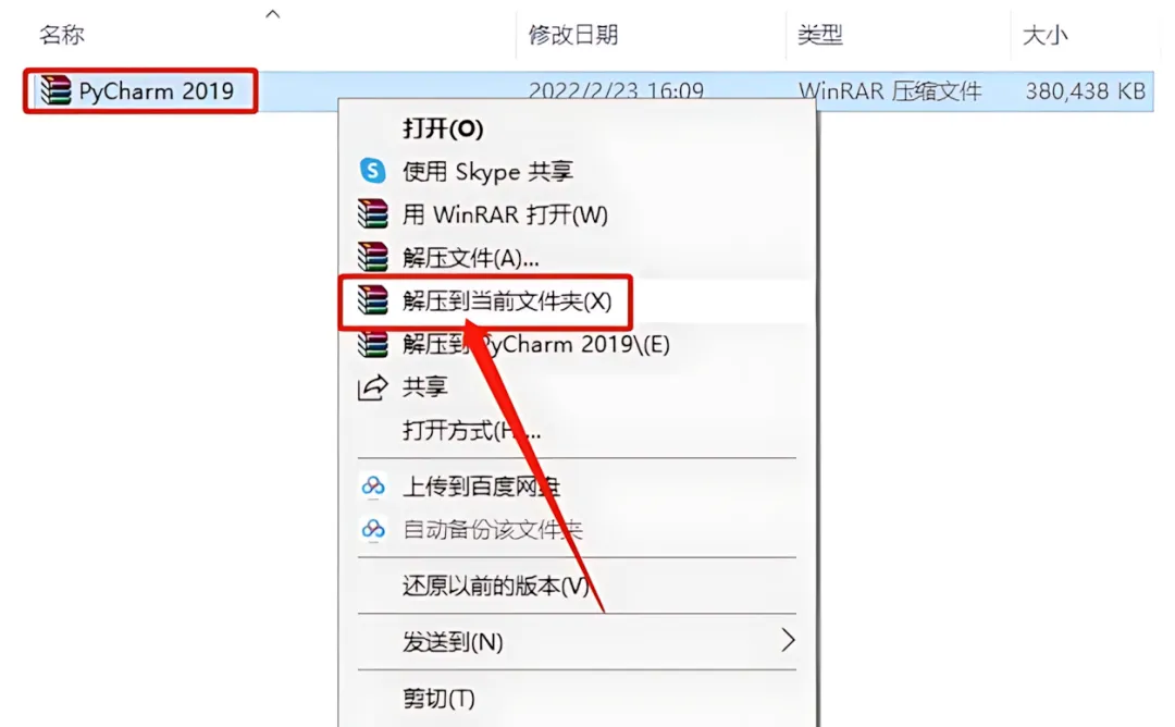 1、下载PyCharm 2019软件安装包到电脑上,右键选择【解压到当前文件夹】。
