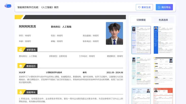 提供丰富简历模板,支持一键切换样式和自动排版。根据不同行业和身份(如应届生、有经验者)选择最适合的简历样式及颜色,满足你的个性化需求。