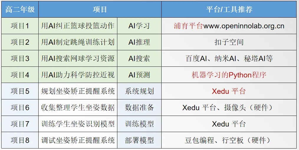 高二下:AI创新实践(规划、数据、模型训练、部署)。