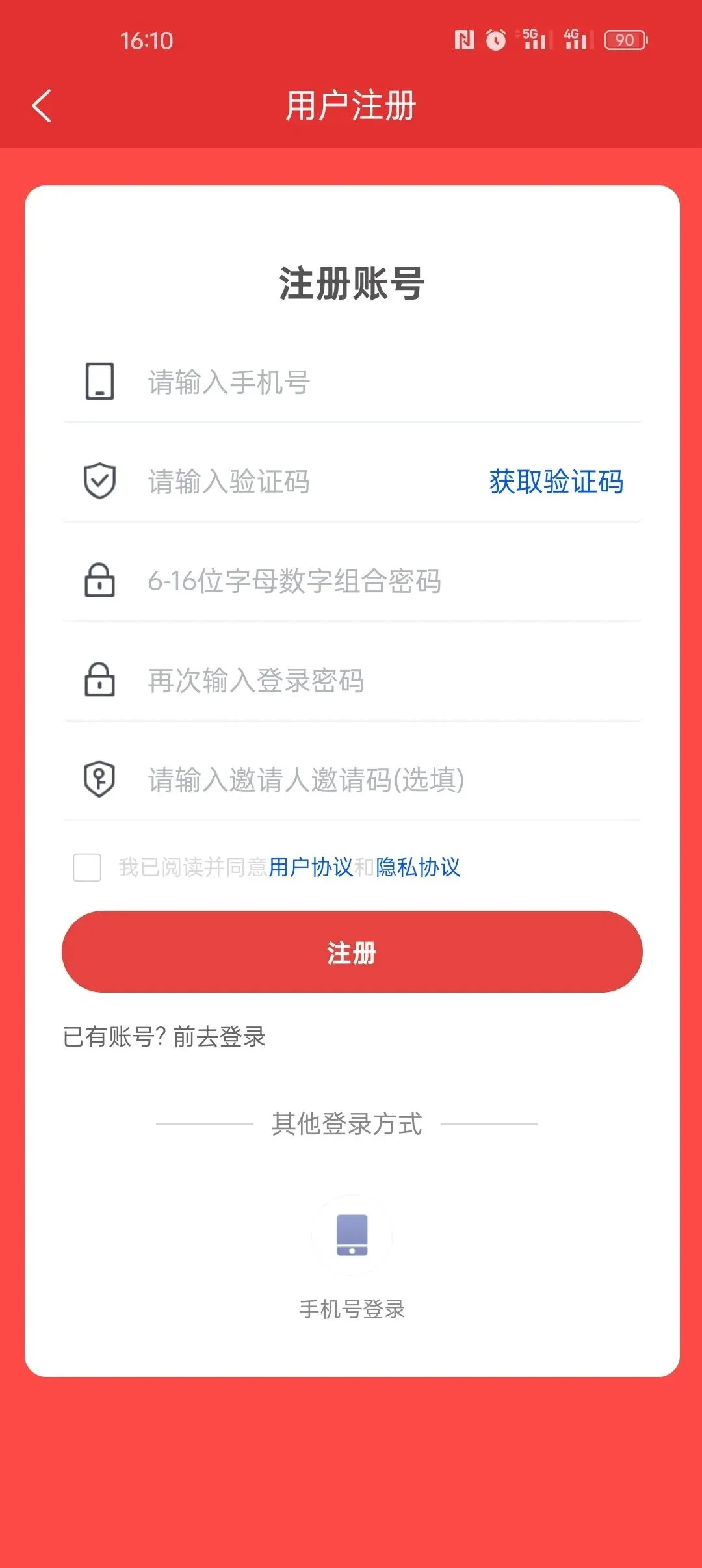 第一步:点击"注册",输入手机号及验证码完成注册;