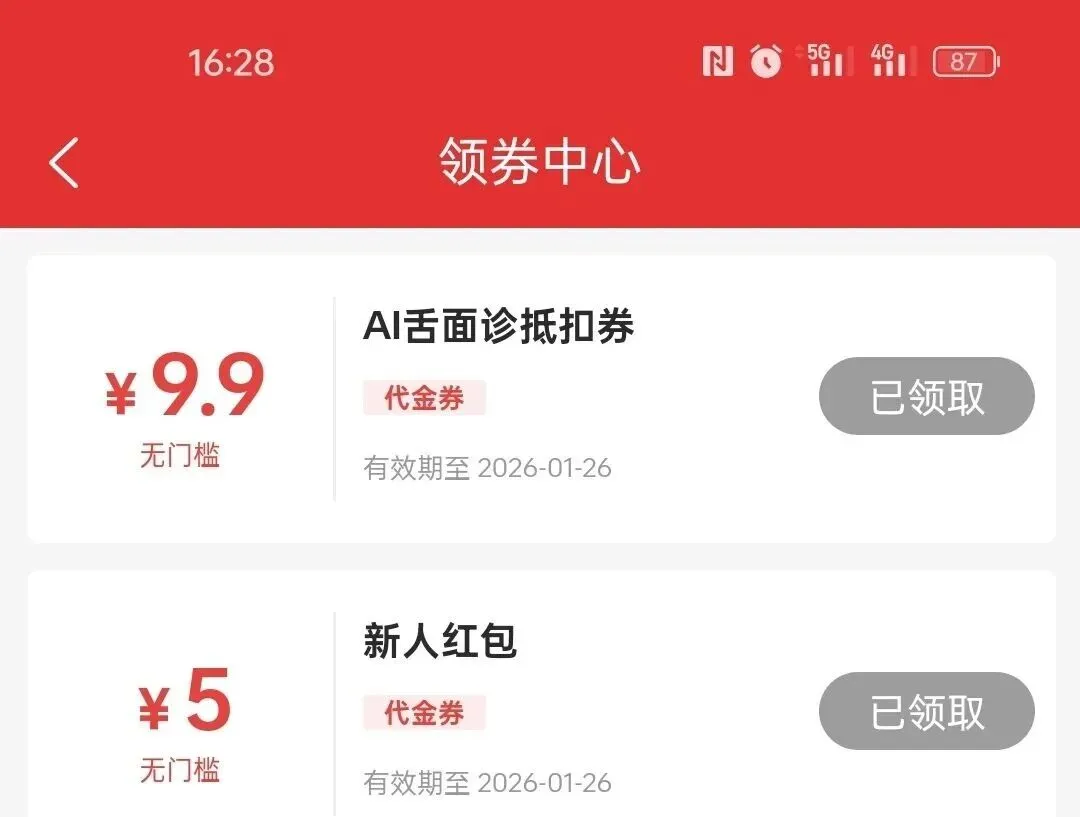 进入APP后点击"我的"-"领券中心",领取9.9元AI舌面诊抵扣券、新人5元无门槛抵扣券。
