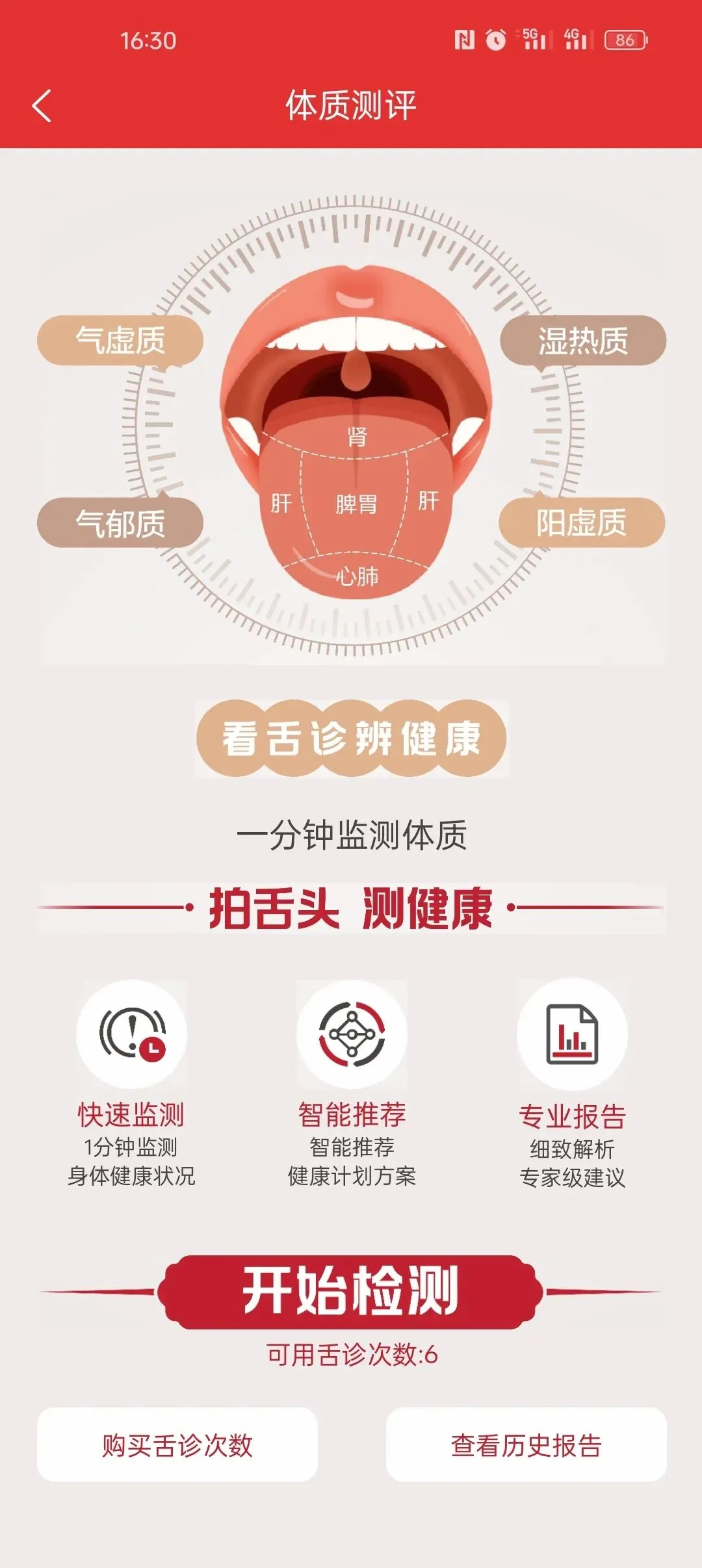 首页点击"健康评估"-“购买舌诊次数”-“开始检测”-完善个人信息包括姓名,手机号,性别,生日,进行手机验证,按照要求上传照片并检测,可在线查看健康报告,也可以在“查看历史报告”或者“我的”-“健康报告”获取报告PDF文档。