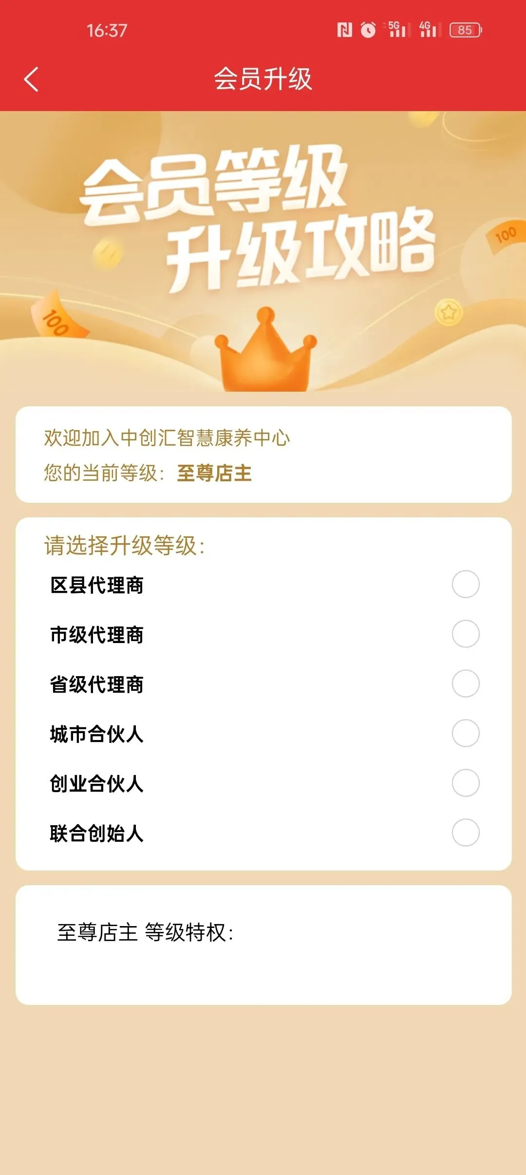 点击"我的"-"会员级别图标",可显示等级说明及升级条件,等级越高权益越丰富。