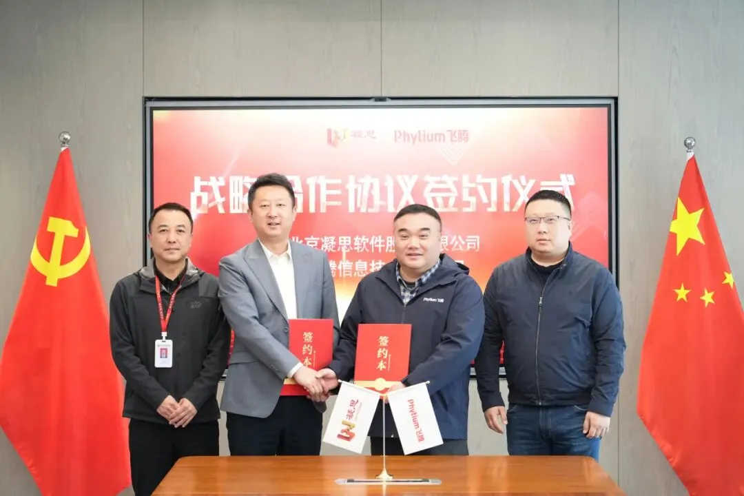 近日,北京凝思软件股份有限公司(以下简称“凝思软件”)与飞腾信息技术有限公司(以下简称“飞腾”)战略合作签约仪式在京圆满举行。凝思软件市场总监葛佰勇、飞腾软件技术方案部高级总监顾剑分别代表双方签署战略合作协议。此次签约标志着双方合作迈入技术共研、市场共享、生态共建的深度协同新阶段,双方将携手打造更安全、更高效、更兼容的国产基础软硬件解决方案,助力关键行业国产化替代与数字化转型。