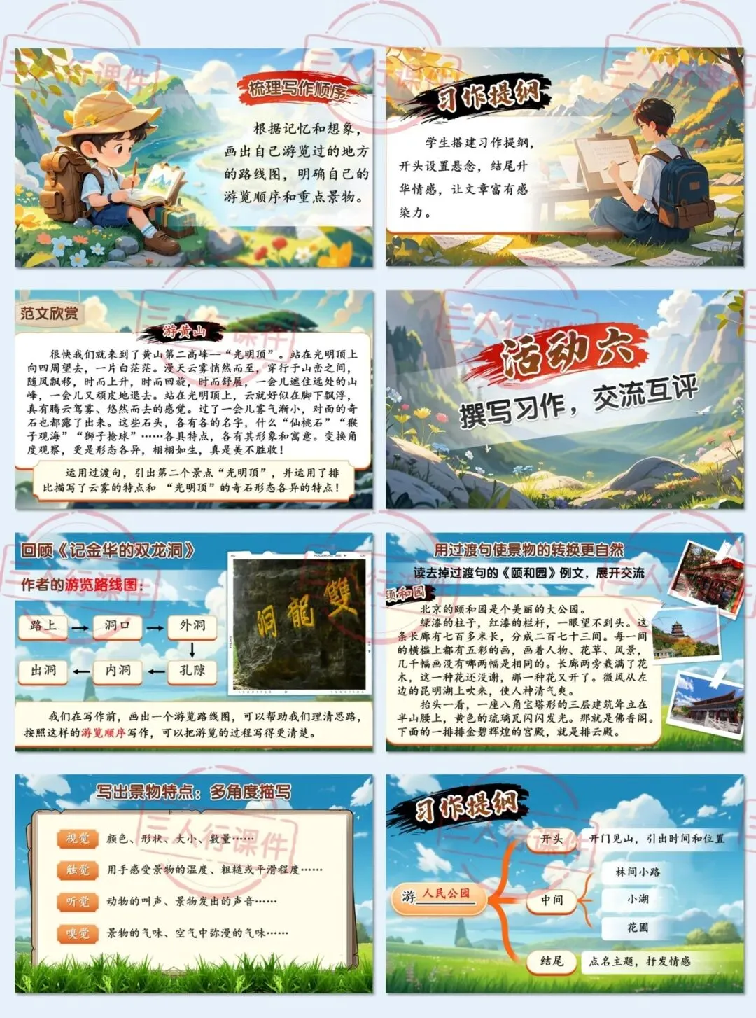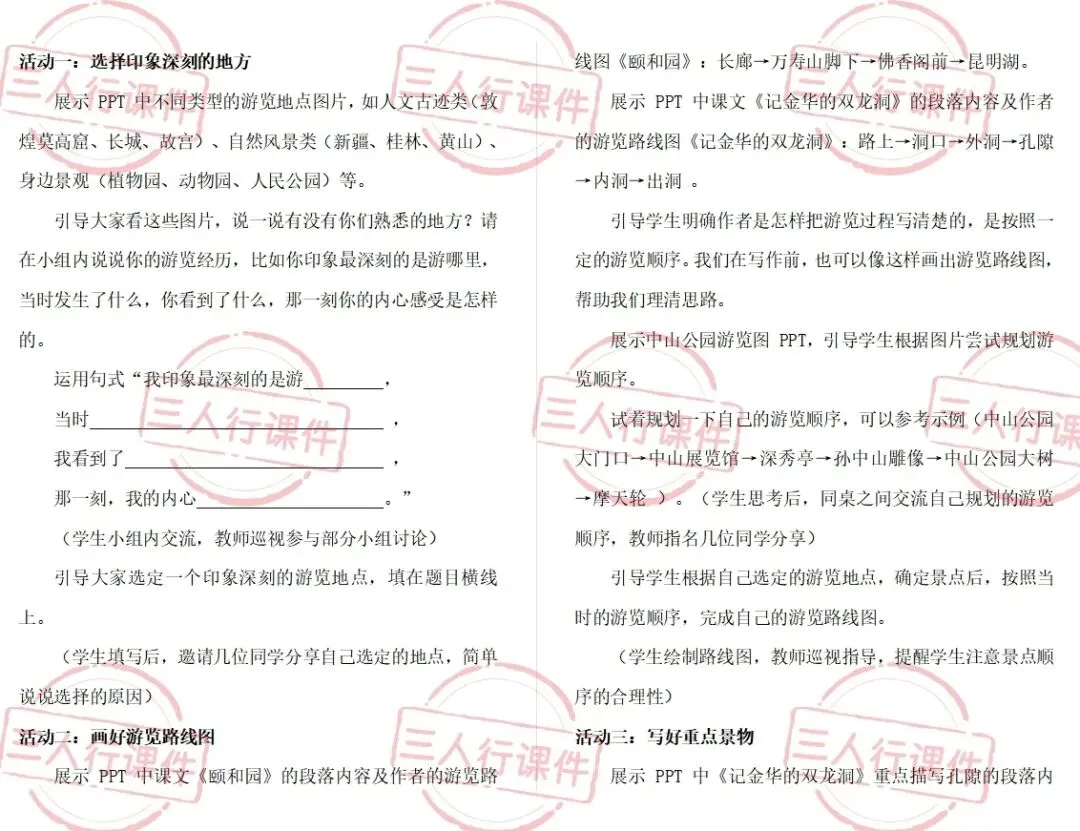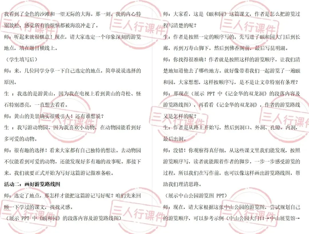 师:没错!你观察得真仔细。从这些课文里我们能发现,按照游览顺序写,读者就能跟着作者的脚步,一步一步感受游览的过程。所以我们在写作前,也可以像这样画出游览路线图,帮助我们理清思路。